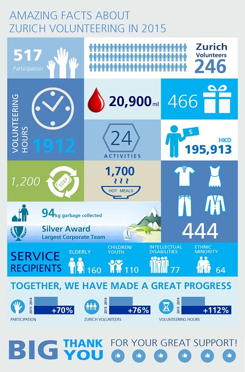 蘇黎世一直肩負服務社會的承諾。香港區的員工去年參與各種社會服務不遺餘力。整體參與率達517人次,較前一年大幅上升70%,成績令人鼓舞。我們的246名義工在去年貢獻達1,912小時於義工服務上,幫助弱勢社群及推動環保意識。